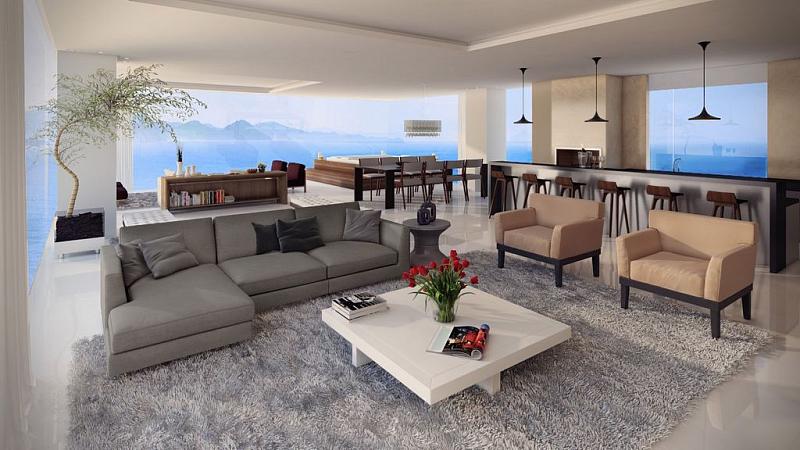 - Living com cozinha gourmet integrados com cerca de 115 m²